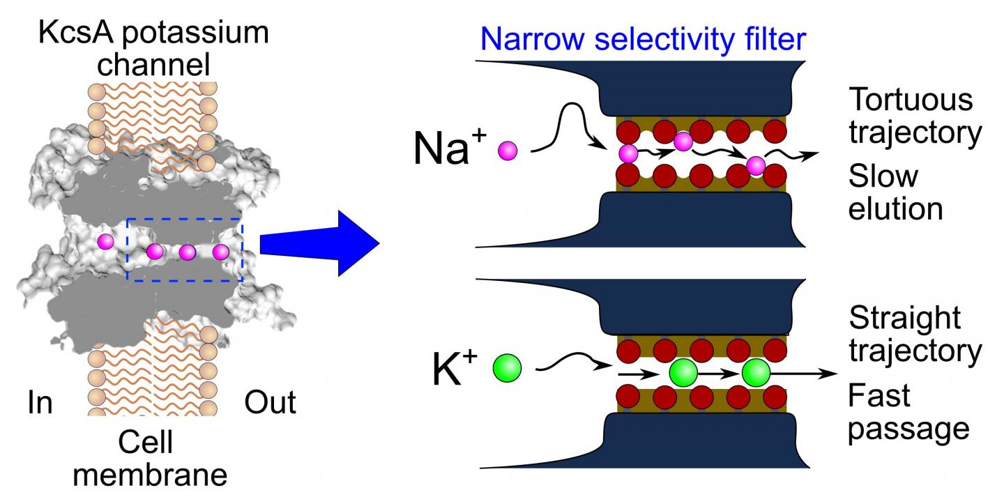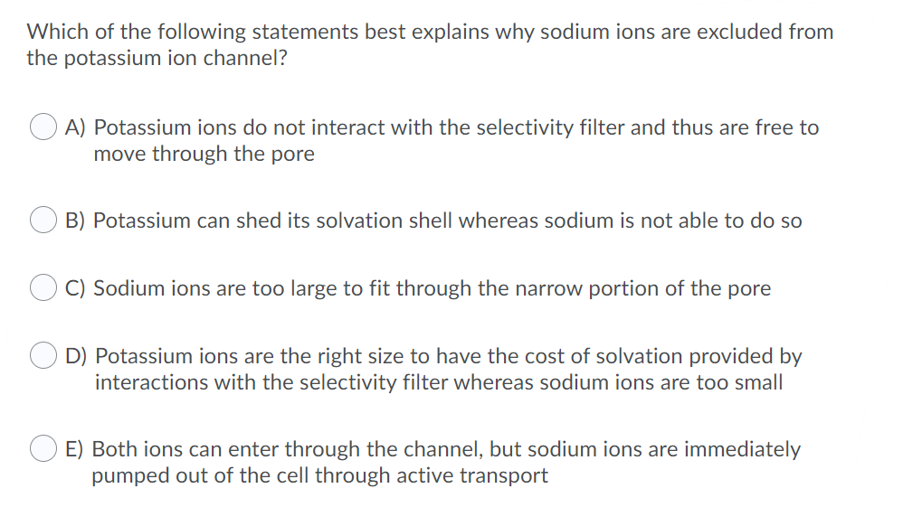 Why do sodium ions need channels in order to move in out of cells. The selectivity filter in the potassium channel is too small for a partially hydrated sodium channel. When the channels are closed no ions can move into or out of the cell.